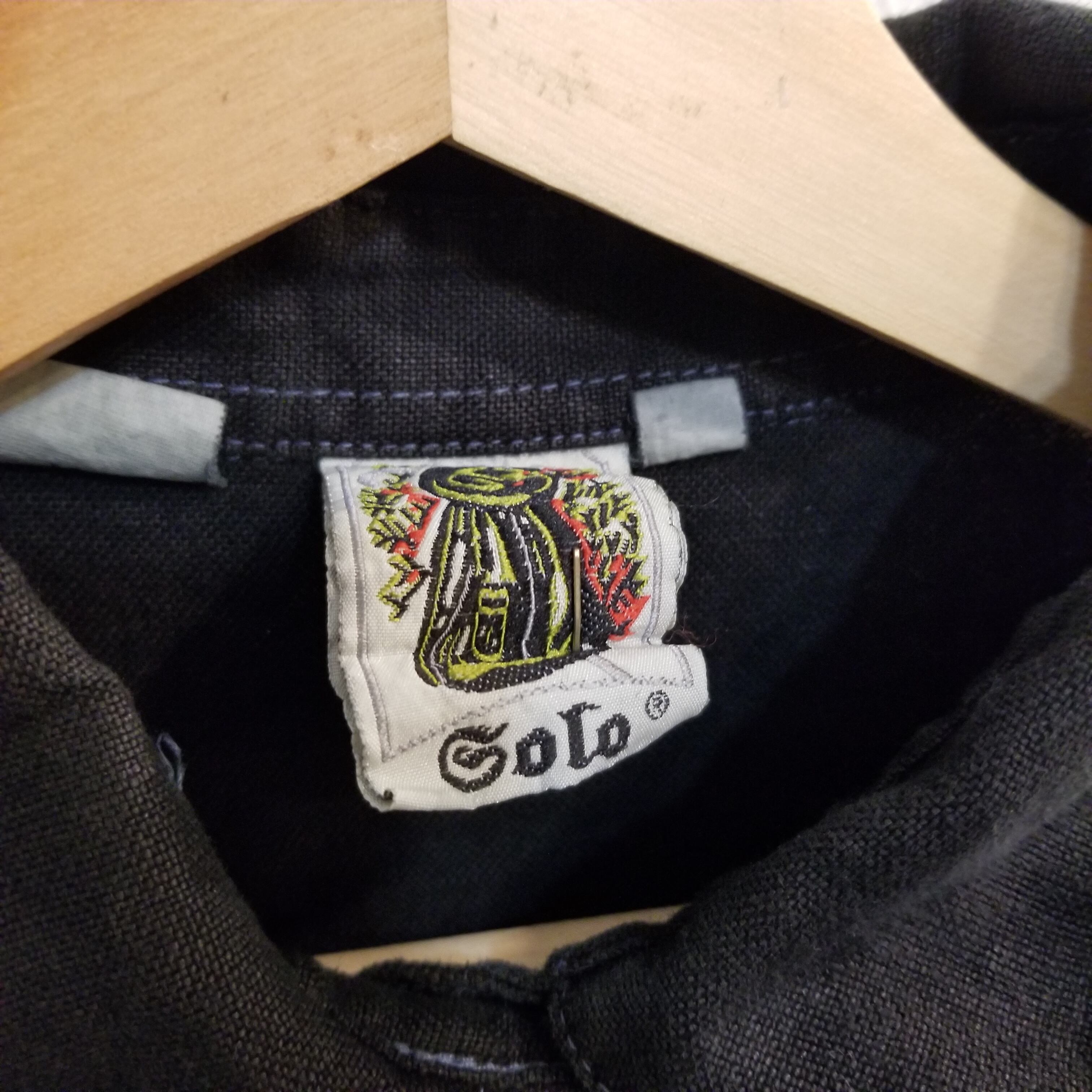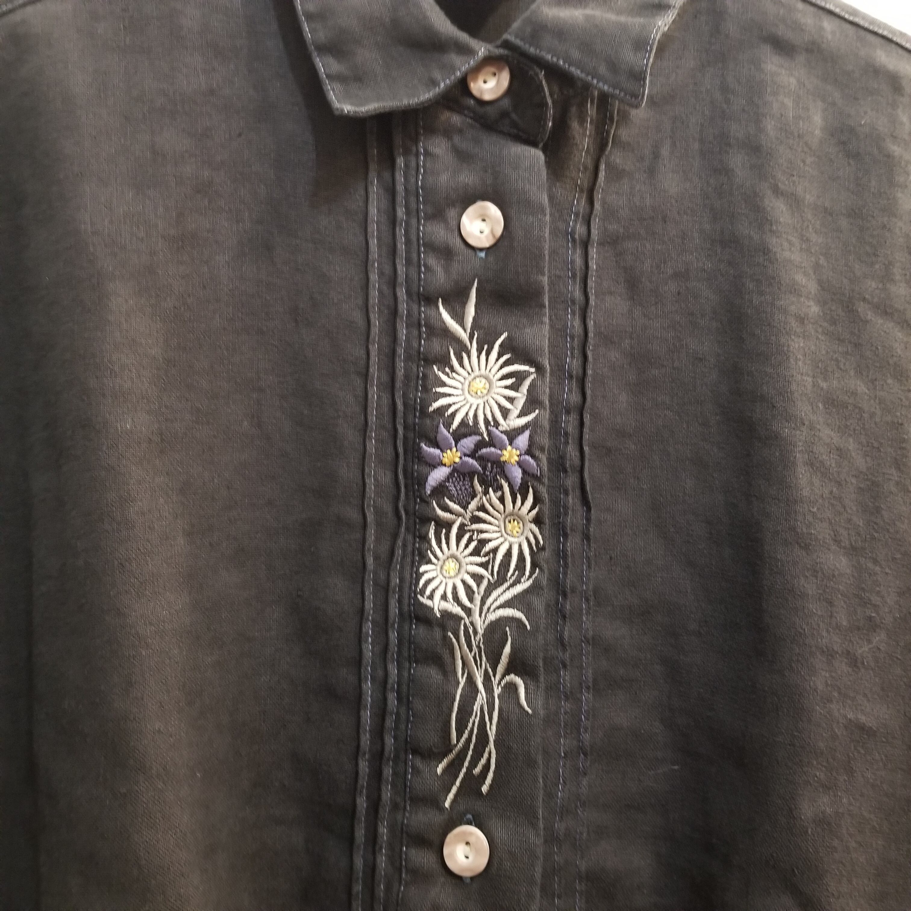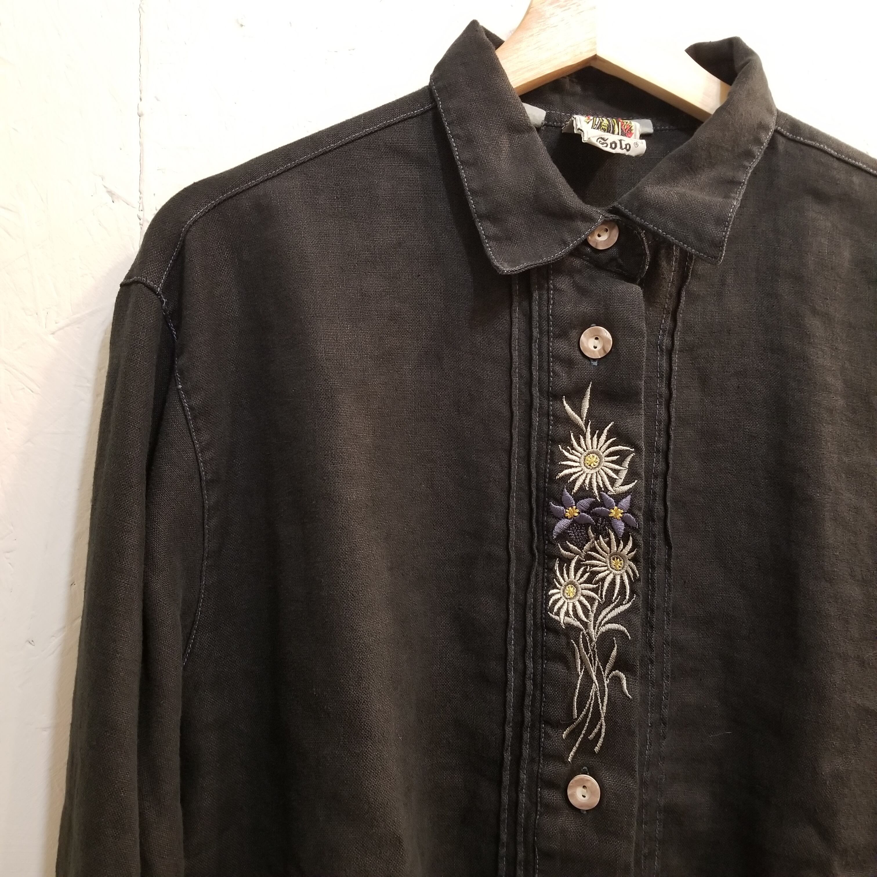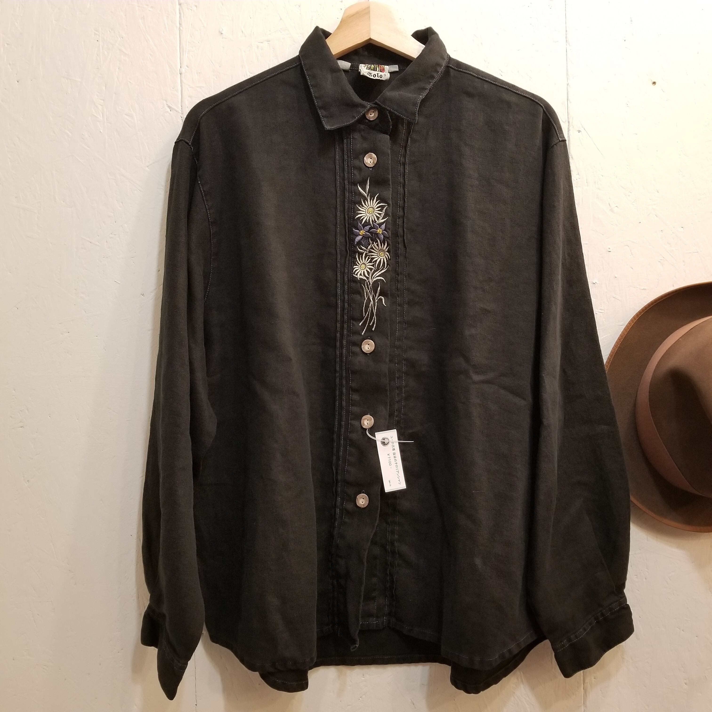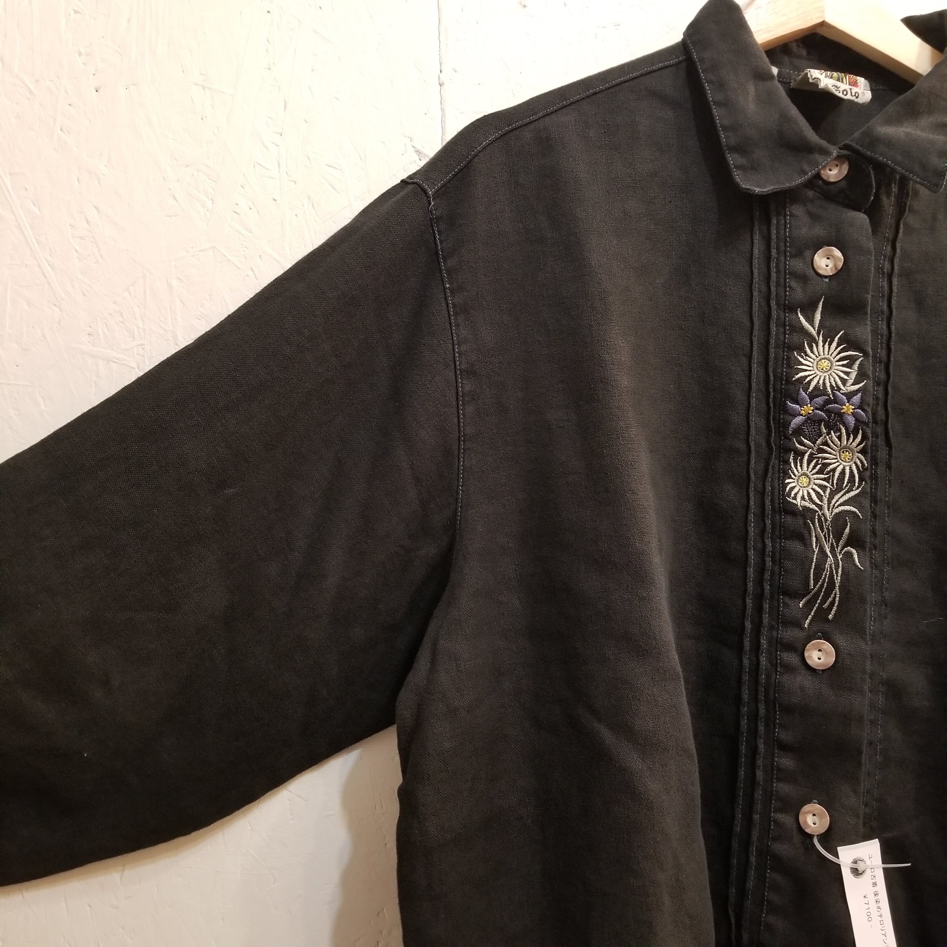 ■商品 :ヨーロッパ古着 SOLO 後染めブラック 麻100% チロリアン シャツ 刺繍 長袖 オーバーサイズ 44 XL位 ヴィンテージ 03D2208