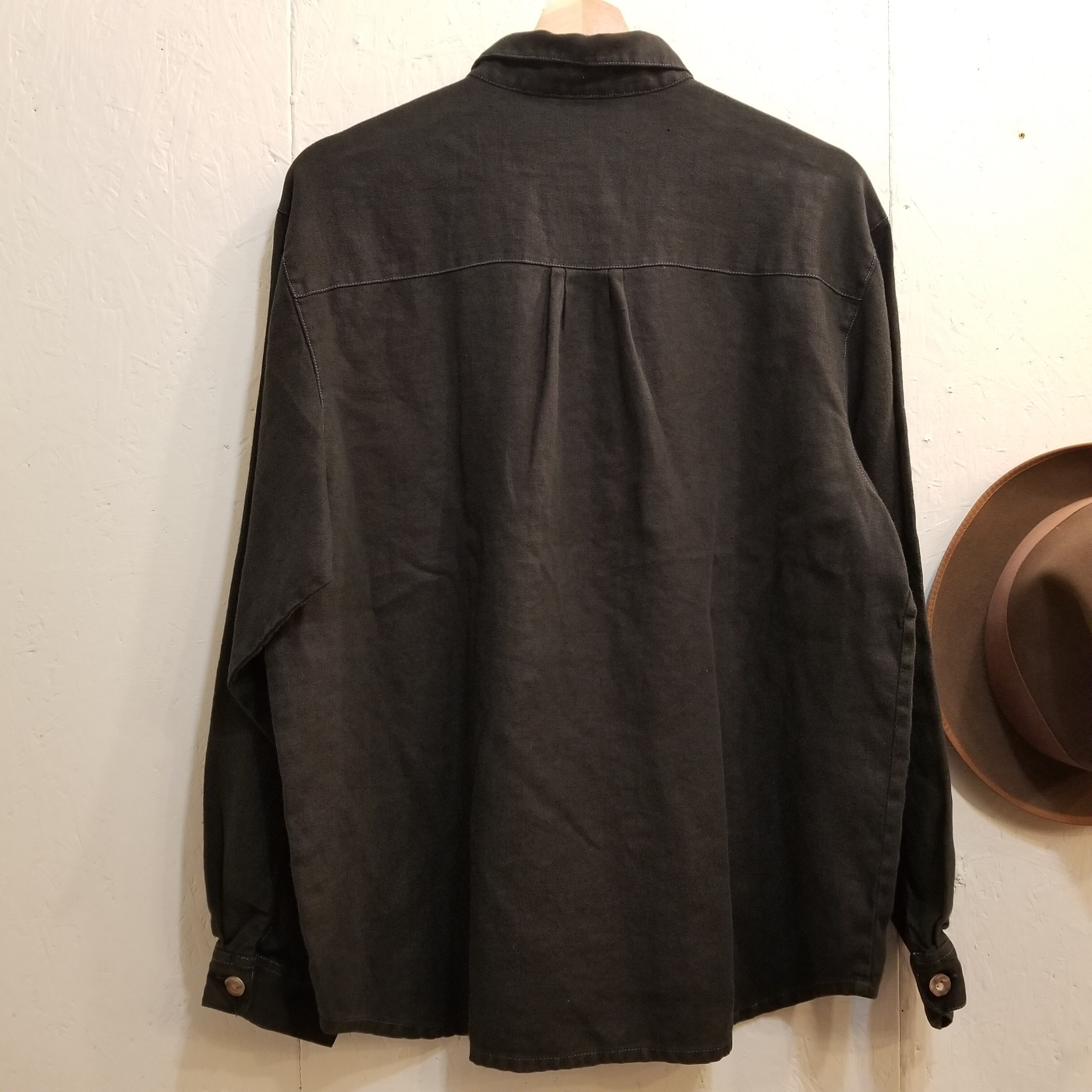 ヨーロッパ古着 SOLO 後染めブラック 麻100% チロリアン シャツ 刺繍 長袖 オーバーサイズ 44 XL位 ヴィンテージ 03D2208